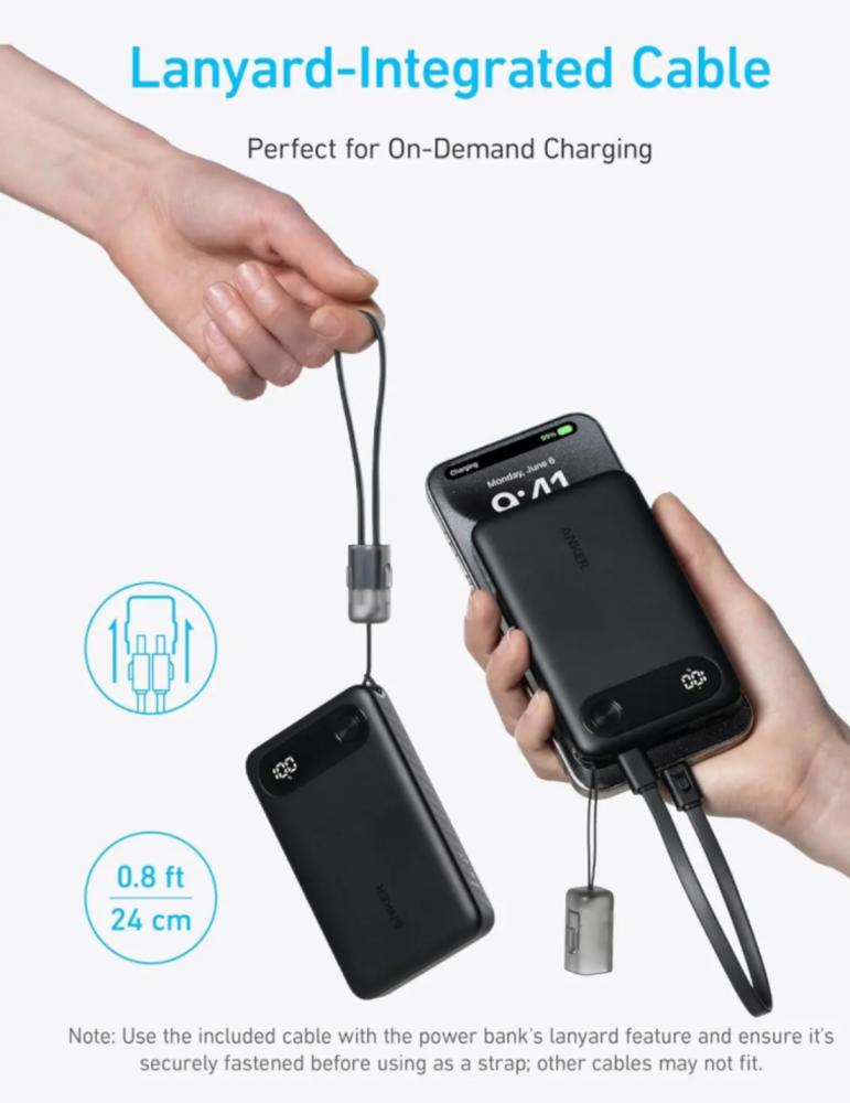 بطارية أنكر بسعة 10000 مللي أمبير بقوة 22.5 واط تتميز بتصميم مضغوط وأداء قوي لشحن الأجهزة بسرعة وكفاءة. تحتوي على منفذين من نوع **تايب سي (Type-C)** ومنفذ **يو إس بي (USB)**، مما يجعلها مرنة في شحن مجموعة متنوعة من الأجهزة مثل الهواتف الذكية، التابلت، وحتى بعض الأجهزة الصغيرة الأخرى.